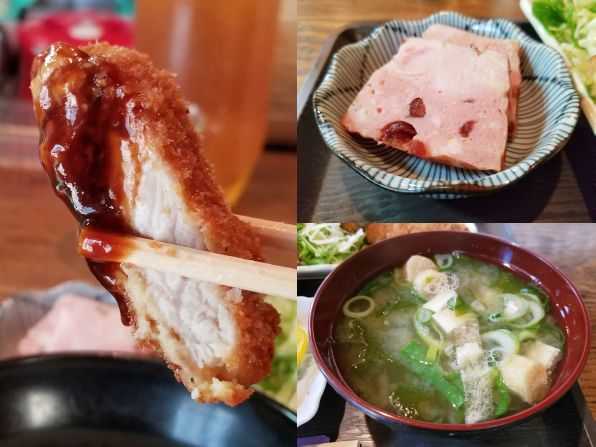 さぁ気になるお味です。。。大皿のトンカツは、サクサク衣をまとい、三位一体(肉・筋・脂)の美味しいトンカツです。。。そしてトンカツソース、マヨネーズ、練り辛子などは、容器のままで出してくれるので掛け放題っ!! いつもの揚げやワカメ、豆腐の入った味噌汁もGOODですし、小鉢はレーズン入りのハムでしたので、今回はW豚でしょう。。。うんうん、旨い旨い~☆