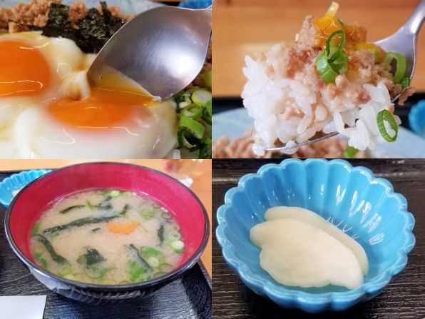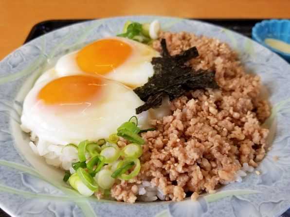 さぁ気になるお味です。。。皿にはライスが敷かれ、その上に鶏そぼろと目玉焼き、ネギ、刻み海苔がトッピングされています、、、鶏そぼろとライスには、ほんのり甘いアッサリ味の、焼鳥タレのようなのがかかっています。。。