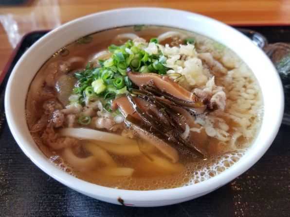 午後1時50分頃の遅い時間に暖簾をくぐると、店内にお客さんはいませんでした、、、私は未食だった"肉うどん(並)"と"おにぎり(シーチキンマヨ+タクワン)"をチョイス!! セルフなのでうどんを受け取り、ネギ、天かす、しいたけ昆布をトッピングして席に着きました。。。