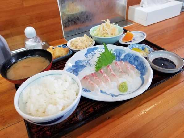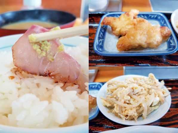 すると"鯛の昆布締め"だと言うことでしたので、"さしみ定食"をお願いしました、、、鯛の旬は春と秋にありますが、春の今は桜鯛のシーズン(秋はもみじ鯛)ですからねぇ。。。選べる小鉢は"とり天"と"もやし玉子とじ"をチョイスして、待つこと約5分、、、定食のできあがりです。。。