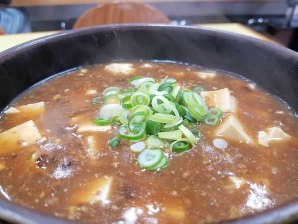 午後1時20分頃に暖簾をくぐると、店内には3人のお客さんです、、、私は1人でしたが、カウンターに2人座っていたので、テーブル席に着きました。。。そして今日は決めていた"麻婆麺"を発注です、、、やがて麻待つこと約5分でできあがりました。。。