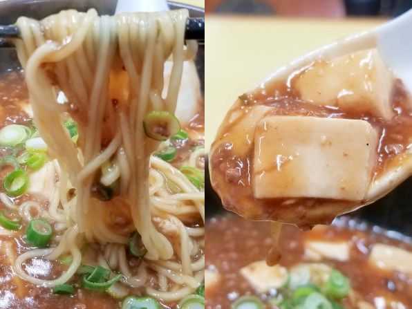 さぁ気になるお味です。。。麻婆豆腐が丼の表面を完全に覆い尽くしていますので、、、グッと箸を突っ込んで、その下の麺を麺を引っ張り出します。。。その麺は中~やや加水多めの緩やかウェーブタイプ、、、ゆで加減は麻婆豆腐の餡が乗るので、やや固目に茹でられています。。。そして麻婆豆腐はピリ辛と甘さと、炒めた肉の芳ばしさのバランスがGOOD!! また小豆大の花椒が入っているので、、、食べるに連れ"麻"が襲ってきます。。。うんうん、旨い旨い~☆