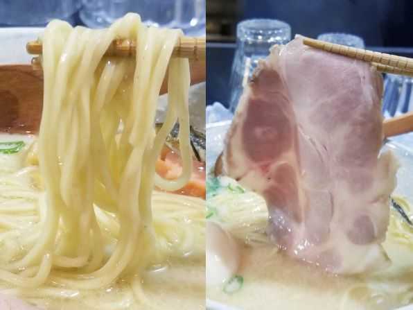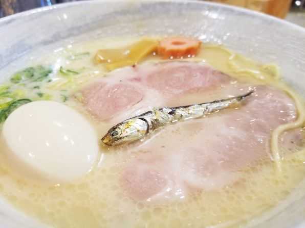 そして麺は中細で全粒粉のストレート、、、中~やや多めの加水で、ゆで加減も程よい固茹でがGOOD!! シコシコ食感にクリーミーなスープがよく絡みます。。。またトッピングのチャーシューが大きい、、、低温加熱の肩ロースのようで、ラーメン鉢の約半分を占領しています。。。その上にちょこんと乗っかったイリコと、讃岐らしい海老竹輪、コリコリのメンマにもこだわりが感じられます!! うんうん、旨い旨い~☆