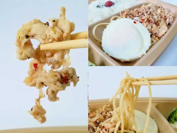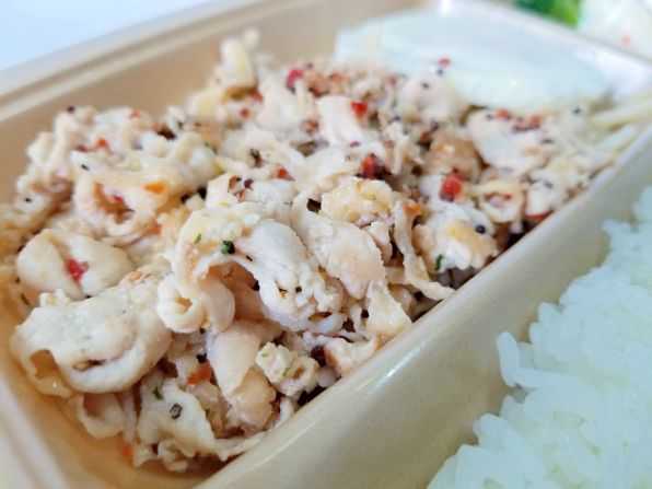 店に帰って、、、さぁ気になるお味です。。。チキンはかしわ(親鶏)の皮や身を薄くスライスして、塩とブラックペッパーで炒められています、、、また唐辛子のピリ辛アクセントもあり、親鶏なので歯ごたえがよく、よく噛んで食べられます。。。もちろんご飯との相性もバッチリ!! うんうん、旨い旨い~☆