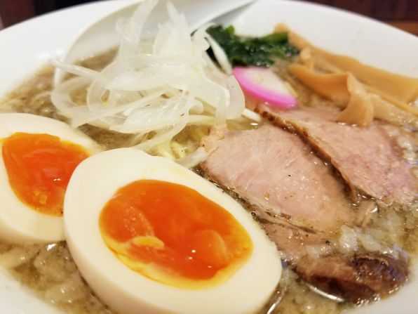 午後1時20分頃に入店すると、店内には2組のお客さんです、、、私は1人なので、いつものカウンター席に着き、"煮干しそば"を注文しようと思ったのですが黒板をみると、今日はまだ"背脂煮干しそば"ができるようです。。。なので"背脂煮干しそば"に"味玉"トッピングでお願いしました、、、やがて待つこと約4分、注文のできあがりです。。。