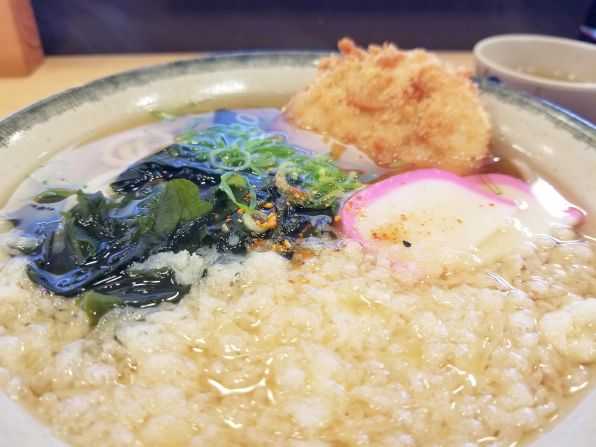 またトッピングは丼の約半分を多う天かす、かまぼこ、わかめ、ネギ、、、それに後乗せのコロッケです。。。そのコロッケがジュワワ~っと出汁を吸って、デュルンデュルンになったのをいただくのが好きなのです!! うんうん、旨い旨い~☆