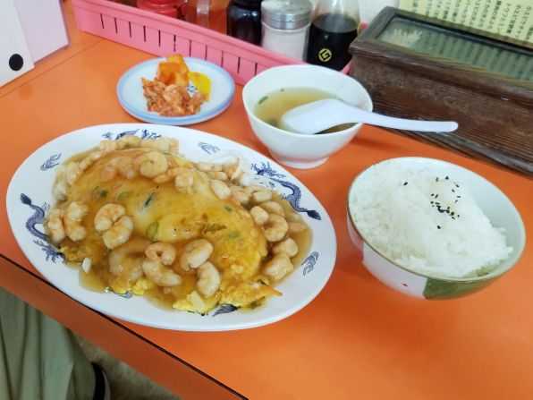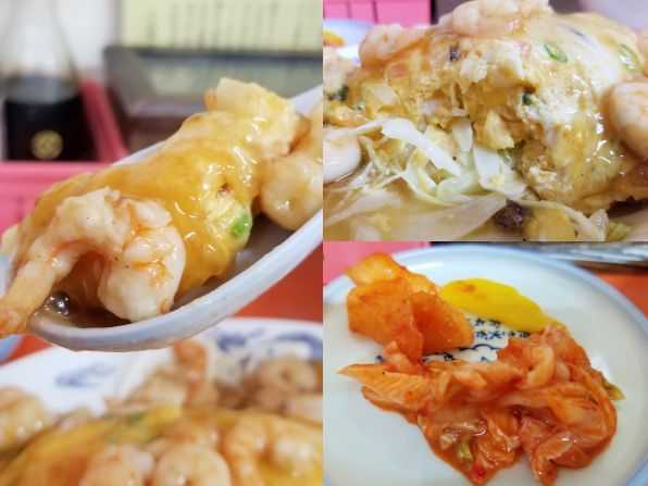 午後1時20分頃に入店すると、店内には5、6人のお客さんです、、、1人の私はカウンター席に着き、予定していた"エビ玉子焼"と"ライス(小)"をお願いしました。。。やがて待つこと約6分、、、出てきた瞬間、"なんじゃこりゃぁ!?"と心が叫びました!! 想像していた"エビ玉子焼"は、玉子の中にエビが入っているものと思っていました。。。でも出てきた"エビ玉子焼"は、餡に絡められたムキエビがトッピングされています、、、しかも集合体恐怖症の人が見たら青ざめる位、大量のムキエビです。。。(笑)