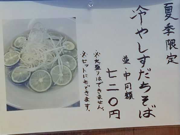 そうそう今回食べられなかった"冷やしすだちそば"、、、毎日早い時間に売り切れになるそうです。。。お昼の遅い私には、、、ちょっとハードルが高いなあぁぁぁ。。。
