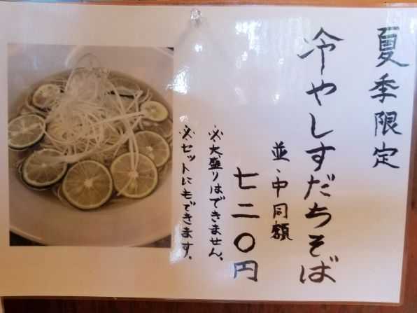 が、今日も遅いお昼で、1時50分頃の入店でした、、、店内には2組ほどのお客さん。。。私はいつものカウンター席に着き"冷やしすだちそば"の有無を確認です、、、おおぉぉぉ、今日は大丈夫っ!! なので中盛でお願いして、、、待つこと約7分でできあがりました。。。