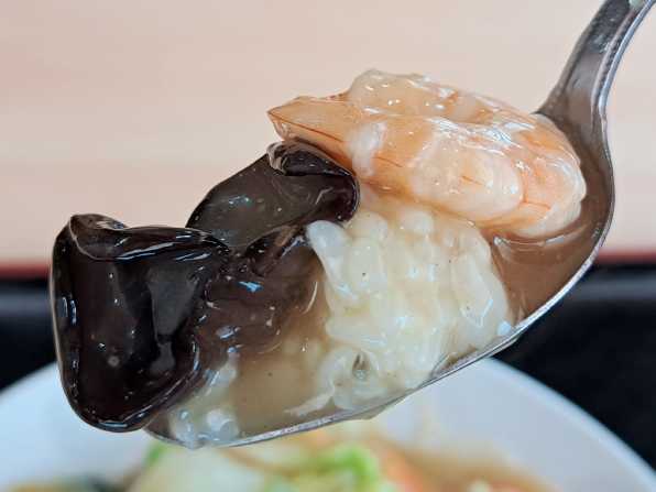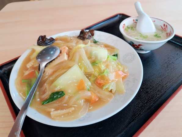 さぁ気になるお味です。。。具材は豚肉、むきエビ、イカ、白菜、玉葱、人参、青菜、筍、キクラゲでしょう、、、中華味の餡で綴じられています。。。しかも超アツアツで、大火傷注意注意っ!! うんうん、旨い旨い~☆
