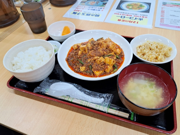 さて水曜日のみ営業している、「秘密基地食堂(自立学習サポート塾 せるすた): リンク多いのでたどってください 」さんに到着したのは12時45分頃、、、店(塾)内にはお客さんが一人でした。。。私はいつものストーブ横席に着き、今日は"陳麻婆豆腐定食"を発注です、、、やがて待つこと約11分でできあがりました。。。