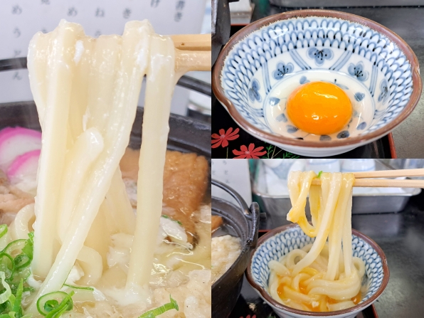 さぁ気になるお味です。。。私的な"鍋焼きうどん"の食べ方で、まずレンゲで卵黄をとんすいに移します、、、そこにアツアツのうどんを入れて、すき焼きのようにしていただきます。。。ほぅほぅほぅ、機械打ちのうどんは、程よいコシに滑らかな口当たり、、、卵黄がデュルルと絡みます。。。そして2、3口いただいたところで、卵黄は鍋にもどし、、、(アツアツが好きなので)今度は鍋から直にいただきます。。。