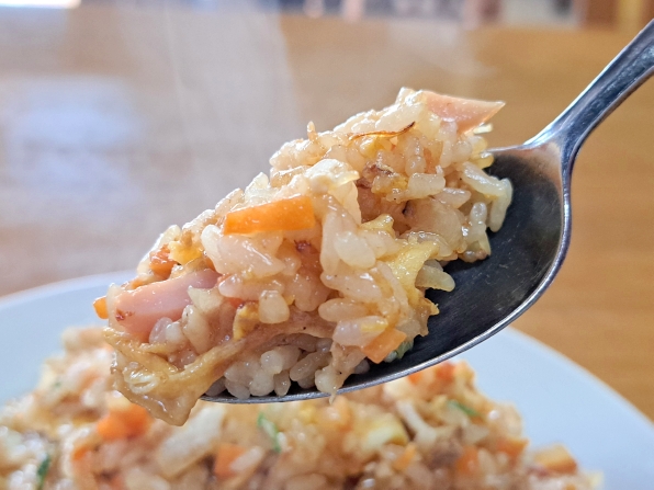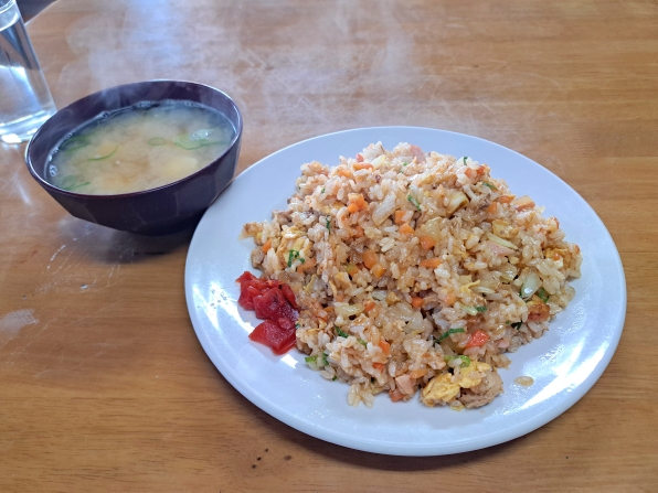 暖簾をくぐったのは1時15分頃、、、店内には1人のお客さんです。。。私は奥のテーブル席に着き、今日は迷わず"ヤキメシ"と"味噌汁"をお願いしました。。。やがて待つこと約5分、、、注文のできあがりです。。。