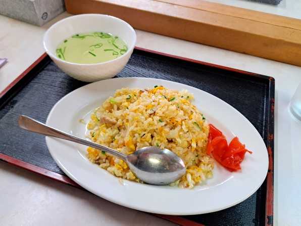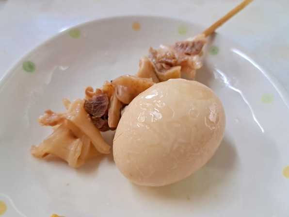 午後12時25分頃に入店すると、店内には5、6人のお客さんです、、、私は"焼めし"をお願いし、"おでん"も二本取って、アクリル板で仕切られた、相席のテーブル席に着きました。。。その"おでん"を食べながら待つこと約5分、、、"焼めし"のできあがりです。。。
