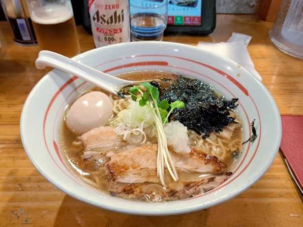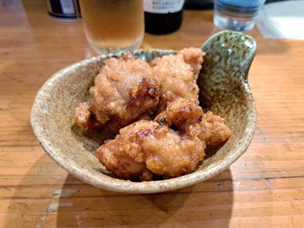さて注文はタッチパネルです、、、前回訪問時に家内が食べた"淡麗中華そば"を特製で、またノンアルビールと"タレからあげ(三個)"も発注しました。。。ノンアルビールはすぐに出てきて、、、待つこと約7分で"タレからあげ"のできあがりです。。。ほぅほぅほぅ、タレは甘酢系なので、チキン南蛮のような感じでしょう、、、でも辛味があってビールにもよく合います。。。やがて待つことさらに5分、、、"淡麗特製中華そば"ができあがりました。。。