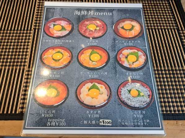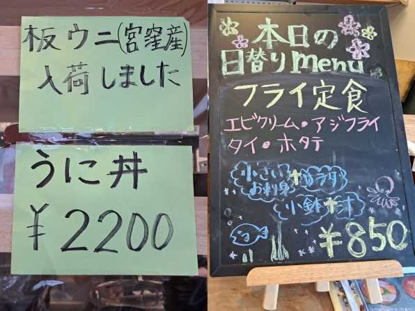 午前11時20分頃に入店すると、店内はほぼ満席状態、、、でもカウンター席が一つ空いていたのでそちらに案内されました。。。で、予定では"日替わり海鮮丼"か、"まかない丼"を食べようと思っていたのに、、、私の席の目の前に"板ウニ(宮窪産)入荷しました"の張り紙が!!