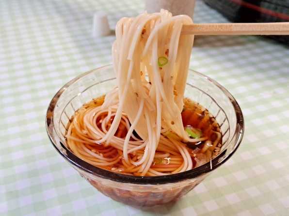 さぁ気になるお味です。。。タライには大量の素麺と大きな氷が入っています、、、薬味を入れた麺つゆに浸してズルル~っ!! ほぅほぅほぅ、麺は流し素麺にできるようにか、固茹ででGOOD!! また麺つゆは濃くて塩味も強めです。。。タライには水気が少ないので、麺つゆも薄くならずにいいただけます、、、なので個人的には、この流れないタライの方が好きでしょう。。。うんうん、旨い旨い~☆