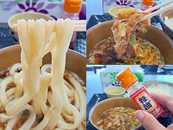 さぁ気になるお味です。。。うどんを入れた器には、素麺のようにタップリの氷水が張られています、、、なので太麺に強いコシがありますねぇ。。。そして温かいつけ汁は、肉うどんのような甘いタイプかと思いましたが、甘みはあるものの魚介系の出汁味が強いタイプです、、、その中にはやはりタップリの牛肉が入っています。。。