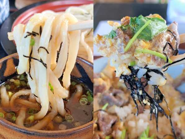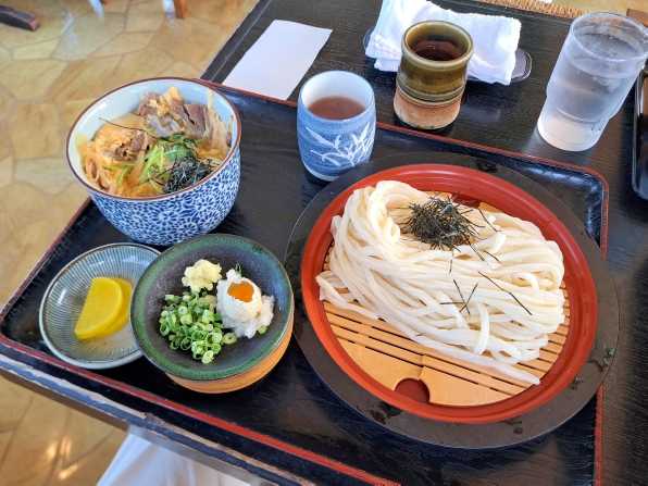 入店したのは午後1時30分過ぎの遅い時間、、、店内にお客さんは一組でした。。。私は奥の二人掛けの席に着き"ざるうどん"と、、、それだけでは物足りなさそうなので"ミニ丼(他人丼)"をお願いしました。。。やがて待つこと約5分、、、注文のできあがりです。。。