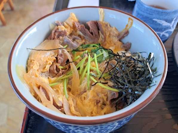 そして"ミニ丼(他人丼)"は、牛肉が玉子と玉ねぎで綴じられています、、、うどん屋さんの出汁なので、味もしっかりしていますねぇ。。。また三つ葉や刻み海苔がトッピングされているのもポイント高しっ!! うんうん、旨い旨い~☆
