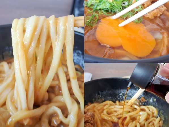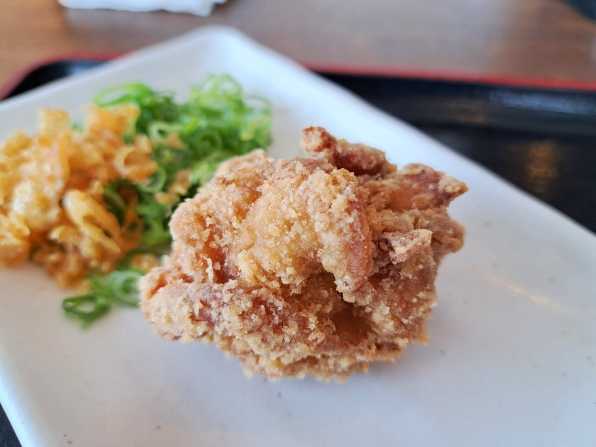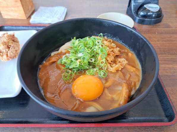 お昼時なので少し混んでいます、、、「つねべぇー」さんはセルフなので、気になった"釜玉カレーうどん(中)"をお願いし、"鶏唐揚げ"を一つ取って会計です。。。釜玉関係は席に届けてくれるということで、、、やがて待つこと約4分、店員さんが運んでくれました。。。