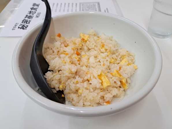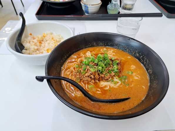 さて午後1時20分頃に入店すると、店内はほぼ満席状態、、、私は3人と一緒のテーブル席に着き、"担々麺"と"ハーフ焼きめし"をお願いしました。。。実は「秘密基地食堂」さんで、このパターンを注文しようと思っていたので、これ以外の選択肢はありませんでした(笑)、、、やがて待つこと約15分、注文のできあがりです。。。