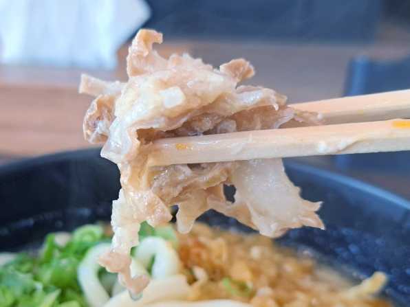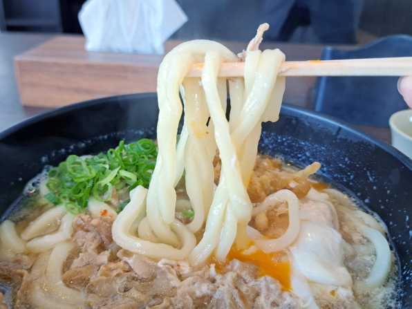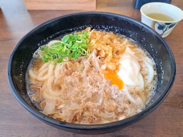 さぁ気になるお味です、、、少し細めのうどんは、釜抜きにしてもらったので滑らかな舌触りと喉ごし、、、う~~んっ、この食感がGOOD!! そして超アツアツ、火傷注意の出汁には、トロ~リと月見の卵が溶け込みます。。。