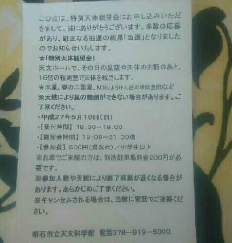 こんにちはアイアン太郎です。5/10日曜日に明石市立天文科学館で開催された特別天体観望会に行って来ました。普通の天体観望会は月に一回開催されていて、プラネタリウムでの解説と最上階にある大望遠鏡で天体観測するというのが内容で、ネットで予約して誰でも申込みできて気軽に参加できます。今回は特別天体観望会で抽選で20名だけなので、大望遠鏡で時間をかけてみることができます。嫁が昨年から行きたいとせがむので、2月に初めて普通の天体観望会に参加。以来毎月参加していますが、雨女の嫁が申込みしてきたせいか、毎回曇り。。。昼間にいくら晴れていても夜は曇り。。。そこで5月の特別天体観望会にアイアンが申し込んだところ、抽選を通っただけでなく、見事な晴天!!初めて大望遠鏡で星が見れるのです。気持ちを高め、いざ明石天文科学館へ!!今日はまず外で双眼鏡で水星を観察して、そのあと、金星、木星、星雲等々を大望遠鏡で観察。双眼鏡で探す水星はプロの方でも難しいそうですが、アイアンはなんとか発見。双眼鏡で探すのもなかなか面白かったです。そのあといよいよ大望遠鏡!!やっぱりでっかい望遠鏡は違いますね。すごい!!一番印象に残ったのは木星。木星の衛星はもちろん、シマシマ模様もくっきり見えました!!天体観測は良いね今日はよく見えて良かったです。嫁と二人で大満足で、帰りにラーメン食べて帰って来ました。アイアンはあんまり天体観測には興味無かったのですが、今回の経験を通じ好きになりました。今日の観望会でも子供はもちろん、大人も子供たちに負けずはしゃいで望遠鏡を覗いてました。もし興味のない方もたまには一度参加してみると良いかも知れません。明石市立天文科学館http://www.am12.jp/今日も最後まで読んで頂きありがとうございました。アイアン太郎にほんブログ村
