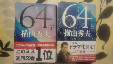 こんにちはアイアン太郎です。昨晩から妻が急遽祖父母の家に行くことになったため、一人気ままにGWを過ごしています。妻がいないと結構暇です。。。アイアン家は共働きなので、家事も分担というかオーバーラップしながらしているので、家事に苦労もしないですし、こんな日は暇なのでぶらぶら散歩がてら本屋に行って、本を物色しております。今日はアイアンの読書レビューと称しまして、横山秀夫先生の「64(ロクヨン)」をアイアンなりにレビューをしたいと思います。なるべくネタバレしないように書くつもりですが、ちょっと内容に触れないとレビューって書きづらいですよね。ストーリーは県警の刑事部から広報へ異動した主人公の三上が記者クラブの対応や、1週間しかなかった昭和64年に発生した、時効まじかの誘拐殺人事件に警察庁長官が視察にくることが決まったが、古巣の刑事部から反対に合い、県警の管理部門と刑事部門が対立。ただこの誘拐事件は県警が抱える爆弾だったことを知り、長官視察の本当の目的を知ってしり三上はその狭間で葛藤する。さらに長官視察前日にD県警を揺るがす事件が発生!!!三上はどうなるか???といったストーリです。ただの刑事ものということではなく、県警の広報官という立場がどういうものか、TV、新聞、雑誌の県警付きの記者がどういうものかというのが良くわかりおもしろかったこと、また警察組織特に地方の警察組織がどういうものかが興味深かったです。警察組織ということでは、私が好きなフジ系ドラマの「踊る大捜査線」で所轄の刑事と警視庁の位置関係が面白おかしく、時にはシリアスに描かれていましたが、警察の組織って表に出てこないですが複雑だなあ~と思ったりしました。ストーリーに関してはネタバレにふれてしまうのであまり書けませんが、いくつものエピソード、ヒントとなるようなことが同時並行で書かれて、最後にすべてがつながるといったサスペンスにありがちな内容ではありますが、アイアンは下巻の半分ぐらいは朝方までかけ一気に読んでしまいました。まとめとしてはよくある刑事ものとは視点が違うので面白いですが、最後まで読んですっきり感はなかったため星3つ(満点5つ)です。64(ロクヨン)横山秀夫先生 64 上 文春文庫 / 横山秀夫 【文庫】64 下 文春文庫 / 横山秀夫 【文庫】ご興味あればぜひ読んでみてください。最近毎週土曜日22:00~NHKでドラマをやっています。ピエール瀧さん主演です。小説のイメージとあっていますね。奥さん役の木村佳乃さん。今回は少し影のある役どころですが綺麗ですね。山本美月さんも綺麗だわ~。あんな同僚がいたら仕事がんばれますよね~。ということで今日も最後まで読んで頂きありがとうございました。アイアン太郎にほんブログ村