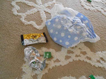 仕事が終わり帰宅して家の鍵を開ける時いぶ~たはワンワンと鳴くのですが良からぬ事を仕出かした時は、サイレント。恐る恐るリビングのドアを開けてみると・・・ ムムム 脱ぎ捨てられたオムツとカーペットに不自然な液体のあとが・・・そして食い散らかした飴とガム。どうやら今回はゴミ箱ではなく(ゴミ箱は椅子の上に上げたので)次女が置いて行ったカバンの中を荒らした痕跡が・・・おりゃ~~前回に引き続き、今回もかいしおらしくトイレ・トレイで待つ振りして~ ちゃんと、おやつ置いて行ってるでしょまったく~母ちゃんの目、きちんと見てごらん か、か、か、かわいい~~ と、馬鹿な飼い主はすぐに許してしまうのでした~ が、 次女の買ったばかりのガムは壊滅状態。紙袋は破られ、バッグの中は犬臭かったそうです。 カーペットにガムが張り付きおしっこも漏らしていたので、すぐにカーペットを洗濯。 帰ってからも一仕事です でも、消化できないガムがきちんと便と一緒に排泄されるか心配でしたが味が味だけに、ミント系のガムは食べなかったようで 大丈夫でした。 いつまで続く、この悪戯・・・(本犬にとっては、真面目な取り組みなんでしょうけどね~) 洗えると楽ちんシャギーラグ ペコラ M サイズ 190×190【ラグマット マット 6畳 6帖 リビング ダ…価格:6,990円(税込、送料込)ユニ・チャームさんは吸収力が違います。SSSを使用中 ユニチャーム ペット用紙オムツ SSサイズ(30枚入)【ペット用紙オムツ】[犬 オムツ ペット…価格:1,695円(税込、送料別)おやつはこの中に【訳あり】ペットのおもちゃ ドギーマン カムガムアミーバー ボンボン S(5)超小・小型犬用 …価格:335円(税込、送料別) 応援ありがとうございますにほんブログ村 ぽちっと感謝です人気ブログランキングへ
