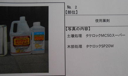 シロアリ予防・駆除の施工をした日は小雨が降る日でした。よほどの強風でない限り、実施するようです。この日は床下と勝手口の間にビニールのトンネルのようなものを即席で作り業者の方が行き来してもキッチンを汚さないように、配慮してくれました。使う薬剤の写真を撮ってくれて薬剤散布がスタートです。この薬剤、蟻の神経伝達部分に作用して死亡させますが、神経の受容体が違うため、脊椎動物にはほとんど影響がないそうです。成分の「クロチアニジン」は毒・劇薬ではないので、人や動物に安心して使えるそうです。そして蟻だけではなく、防腐・防カビ効果もあります。施術の様子はデジカメで撮影。木の部分を処理しています。床下基礎のコンクリートを処理。狭い所で大変な作業です。玄関下は床下から処理できないので、玄関の一部に穴を開けてそこから薬剤を注中。処理後はきちんと蓋をしてわからないようにしてくれました。これでシロアリ予防は完璧大変な作業、ご苦労様でしたいぶ~たは作業の邪魔にならないように母ちゃんと一緒にずっとソファーにいたですよぉ~少し独特なニオイがしたですけどぉ~一応元気なので、大丈夫みたいですよ~臭いが気になったので、換気扇を回し、床下収納庫に食品を戻したのは一週間後でした。そうそう、意外だったのはシロアリ被害は木だけだと思いましたが軽量鉄骨やコンクリートでも被害に遭うそうですよ。これで10年は安心かな応援ありがとうございますにほんブログ村ポチット感謝です人気ブログランキング