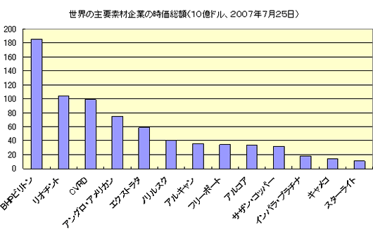 今日のまとめ 1. 素材セクターはM&Aの嵐の渦中にある 2. 一握りのグローバル企業の寡占が強まっている国際的な業界再編の動き いま世界の素材産業は大きな業界再編の嵐に巻き込まれています。最近起こったM&Aの代表的なところをまとめると次の表のようになります。買収企業被買収企業エクストラタ・ノルリルスクライオンオアフリーポート・マクモランフェルプス・ドッジランディーンリオ・ナルセアランディーンユーロジンクCVRDインコエクストラタノーランダノーランダファルコンブリッジCVRDカニコリオチントアルキャン 僅か一年足らずの間にこれだけ多くのM&Aが起こる背景には一体何があるのでしょうか。 先ず素材各社は市況の高騰でどこも空前の利益を上げています。しかし新規の鉱床を発見するのは難しいですし現在生産を続けている鉱床はだんだん深くなり採掘コストは漸増しています。このため各社とも長期に渡る資源の確保が急務となっています。手っ取り早い方法は会社ごと買ってしまうやり方です。また、昨今の好景気で鉱業の会社はどこもキャッシュが余っており下手をすれば買収のターゲットにされてしまいます。それを防ぐには自らが買収企業として他社を呑み込み、その際、負債を背負い込めば他企業からつけ狙われる危険が減ります。今なら比較的低利で借り入れが可能ですしどんどんキャッシュが入ってくるので借金の返済も迅速に行えます。利払い負担が軽減すれば利益もぐんぐん伸び更に株価が上がるでしょう。このような好循環が買収ブームを煽っているわけです。この結果気がついてみると巨大コングロマリットに世界の鉱山がどんどん吸収され、ごく一握りのグローバル企業が世界の資源を支配する構図が出来上がりました。 これらの企業の多くは多国籍企業であり世界の多くの地域に鉱床を持つと同時に世界中の顧客と商売しています。つまり「これはどこの国の企業だ」という風に国籍を特定することは極めて困難なのです。逆の見方をすればこれらの企業の全てがBRICsの勃興がもたらす素材ブームの恩恵を直接蒙っている企業だと言えるでしょう。大手三社の去年の部門別利益構成は次のようになっています: なお、リオチント(ティッカー:RTP)は最近、アルキャン(ティッカー:AL)の買収を発表しています。ですから今後アルミニュームの比率が高まると思われます。同様にCVRD(ティッカー:RIO)はインコを買収しましたので今後ニッケルの比率が高まると思われます。アルコア(ティッカー:AA)はアルキャンに買収提案していたのですがリオチントがより良い条件を提示したためアルキャンに逃げられてしまいました。そのため今度は逆にアルコア自体が M&Aのターゲットになるのではないかと見られています。フリーポート・マクモラン(ティッカー:FCX)はフェルプス・ドッジを買収した際に負債を抱え込んだので今は買収のターゲットとは看做されていません。サザン・コッパー(ティッカー:PCU)はミネラ・メヒコと合併しメキシコとペルーに特化した銅のピュア・プレイとなっています。キャメコ(ティッカー:CCJ)は最近注目を集めている原子力発電の分野を代表するウラニウムの業者です。同社はカナダ、サスカチュワン州のマッカーサー・リバーに世界最大のウラニウム鉱山を所有しています。同社のウラニウム鉱床は純度が極めて高くユニークな資産です。しかし最近は出水などの鉱山の操業上の問題が度重なり投資家の落胆を誘っています。さらに同社のウランは長期契約を履行するためにスポット価格の半値程度で売られています。ウランは国家安全保障上の重要な資源ですからキャメコは外国資本が1社で15%以上の株式を取得することを禁じています。インドのスターライト(ティッカー:SLT)はインド最大の非鉄金属の企業で銅、亜鉛、アルミニュームが中心です。インドはBRICsの中でも特にインフラストラクチャーへの投資が遅れており今後大きな成長が期待できる市場です。