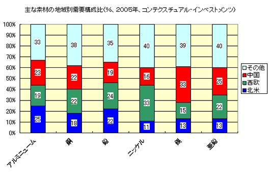 今日のまとめ 1.素材のセクターはグローバルな視点から分析する必要がある 2.近年の好景気で需給は引き締まっている 3.全ての工業向け金属の価格が高騰している BRICs経済が需要構造に与える影響素材の需要と経済の発展段階は密接な関係があります。例えば錫や亜鉛は比較的発展途上国からの需要が高いです。一方、鉛、アルミニューム、ニッケルは先進国からの需要が高いです。 こうした違いはどうして出るのでしょうか。その答えは各々の素材の用途にあります。錫はブリキやハンダに使われます。また亜鉛はトタン板を作るのに使われます。これらの製品はどちらかと言えば発展途上国で多く消費されます。一方、鉛の消費の8割は車のバッテリー向けです。アルミニュームは航空機や自動車などの輸送機器、建設、アルミ缶などに使われます。ニッケルはめっきやニッケル・カドミウム電池、リチウム電池、ステンレス鋼などの製作に使用されます。これらの製品はどちらかと言えば先進国が主な市場です。銅は建設、製造業、輸送機器、カーペットや靴下などの商品と多岐に渡る用途があります。特筆すべき点としては中国における銅の消費の約半分は電線に使われているという点でしょう。世界銀行によると1980年から2000年にかけての高所得国(アメリカ、EU、日本など)と発展途上国の年間平均GDP成長率はそれぞれ2.9%と3.4%でした。つまり両者の成長のスピードには余り差異は無かったのです。しかし近年は発展途上国が持続的に高所得国の成長率を大きく引き離しています。 注:発展途上国(*)というのは中国とインドを除いた数字世界銀行ではこのような発展途上国の高所得国に対するアウトパフォーマンスは今後も長期に渡って続き、結果として発展途上国が世界経済全体に占めるシェアは着実に上昇してゆくと予測しています。 錫や亜鉛は鉱業に携わる業界人の間では「プアーマンズ・メタル」、つまり「貧乏人の金属」という風に形容されることもあり、長年、先進国では需要が低迷していました。それらの金属が今、力強く復活し、活況を呈している背景には上に見たような世界経済の成長の軸足が発展途上国にシフトしていることが深く関係しているのです。BRICsの中でも先頭を走る中国は今どんどん高所得国へ追いつこうとしています。従って中国の場合はむしろアルミニュームのような「リッチマンズ・メタル」に注目しないといけないのかも知れません。下の図は10年前と比較してアルミニュームの一人当たり消費量がどう増えたかを示したグラフですが中国の伸びが顕著ですね。先進国の場合、一人当たりの消費量は20キログラムを超える国が多いです。中国の場合も当然、いずれそういう水準に到達すると思われます。例えば航空機はアルミニュームがふんだんに使われている製品の典型例ですが下のグラフは世界の航空機発注に占めるBRICsのシェアを示しています。実に世界の需要の37%がBRICsから来ているわけです。 このようにBRICsはこれまで主に先進国が中心となって消費してきたメタルに関してもどんどん消費しはじめています。つまり全ての素材の需給関係にインパクトを与えているわけです。これは素材メーカーにとっては新しい操業環境であると言えるでしょう。このような現実に対応するべく各社は買収合併などを繰り返しており、世界の素材業界は今、戦国時代に突入しているのです。