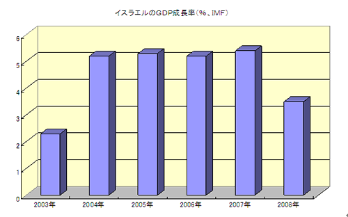 今日のまとめ 1、全体としてイスラエルの経済は好調である 2、財政政策は保守的であり収支は改善している 3、為替の安定がインフレを比較的低く抑えている ■イスラエルのGDP成長率 近年イスラエルの経済は好調に推移しています。2006年にイスラエル北部はレバノンとの紛争で経済が混乱しました。それにもかかわらず、2006年から2007年にかけてのGDP成長率は5.25%としっかりした成長を記録しています。IMFの予想では今年のイスラエル経済は世界経済の減速の影響で3.5%程度の成長にとどまるとみられています。これは近年の5%を超える成長率からすれば少し低いですが、それでも立派な水準だと言えると思います。イスラエル政府は財政収支改善を目指しており、公共部門での支出を抑え気味にしています。それにもかかわらず、経済が好調だったのはその他の部門がまんべんなく成長に寄与したためであると言えるでしょう。 ■イスラエルの財政政策 近年のイスラエル経済の好調で税収は高水準でした。その一方で支出を抑えたため、イスラエルの財政収支は下のグラフに見られる通り随分改善してきています。イスラエル政府は政府の負債を圧縮することに努めています。目標としては2015年までに負債比率を60%にまで下げていく計画です。 ■イスラエルの失業率 イスラエル企業の業績はおおむね堅調で、バランスシートもどんどん強固になっています。こうした民間部門の好調を受けてイスラエル企業は雇用に対して積極的であり、失業率は着実に下がってきています。 ■インフレ イスラエルは過去にハイパー・インフレを経験しています。その苦い経験を生かして保守的な財政政策を採用したためイスラエルの通貨の安定感は最近増してきています。このところイスラエル・シェケルが強かったため輸入品の価格が安定し、これが物価上昇を比較的低く抑えることに貢献しました。 ■政策金利 バンク・オブ・イスラエル(イスラエル中央銀行)は政策金利を2006年10月のピークである5.5%から2007年6月には3.5%にまで下げてきました。その後、2007年12月にはインフレ率が3.4%に上昇したため利上げに転じ、2007年8月から3度に渡り利上げしました。2008年1月の時点での政策金利は4.25%になっています。 ■貿易収支 今後、世界各国経済がスローダウンすることが考えられるためイスラエルの輸出も減速すると考えられます。このため貿易収支は若干悪化すると予想されています。