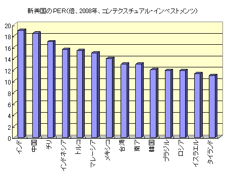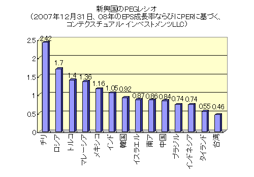 ■今日のまとめ 1. 新興国の株式市場は年初から下がっているところが多い 2. 業績予想にもかなり変化が出た国が多い 3. PEGレシオは全般に下がった 米国のサブプライム問題の余波を受けて新興国の株式市場も大きな調整を入れる市場が相次ぎました。加えて先進国の経済成長見通しの暗転で新興国の企業の業績見通しにも変化が出ました。主な修正点としては: 1. 輸出型企業を中心に業績予想が修正された 2. 金融市場に収益が左右されやすい業種で業績予想が修正された 3. 原油高等商品相場の水準を反映させて業績予想が修正されたが挙げられます。これらのことから今年の年初の時点での新興国各国のPEGレシオ(*)と3月20日現在のPEGレシオでは極めて大きな変化が出ています。 チリの市場は年初から7%程度下落しましたが業績予想が下方修正されたため、PEGレシオは悪化(=増大)しています。相変わらず新興国の中で最も割高な市場です。 メキシコの市場は年初から3%程度の調整となっています。メキシコは米国に隣接するため米国経済への依存度が高く、業績予想は下方修正されています。これを受けてPEGレシオは大幅に悪化し、現在ではチリに次いで新興国の中で2番目に割高な市場になっています。 トルコの市場は年初から28%程度の大きな調整となっています。業績予想は下方修正されましたが株価の下落の方が急激でしたのでPEGレシオは1.4から1.1へと改善しました。 韓国の市場は年初から13%程度の調整となっていますが業績予想も少し下方修正されました。PEGレシオは0.92から0.85へと若干改善していますが他の国の水準調整が大きかったため、相対的には割高さの順位が上がり、これまでの割高な順で第7位から今回は第4位へと繰り上がりました。 インドの市場は年初から25%程度の調整となっています。業績予想もITアウトソーシング企業を中心に下方修正されました。業績予想の下げより株価の下落の方が急でしたのでPEGレシオは1.05から0.84に改善しています。 南アの市場は年初から3%程度の調整を見ました。業績予想も堅調です。したがってPEGレシオも比較的一定で、0.86から0.78へと下がった程度です。 台湾の市場は年初の水準とほぼ横ばいです。一方、米国経済の減速を受けて業績予想は下がりましたからPEGレシオは逆に上昇しています。もはや世界で最も割安の市場ではなくなりました。 マレーシアの市場は年初から17%程度の調整となっています。一方、業績予想は改善を見ましたのでPEGレシオは大きく改善しました。 インドネシアの市場は年初から11%程度下げています。業績予想も少し悪化した結果、PEGレシオはほぼ一定でした。 中国の市場は指数にもよりますが年初から21~25%程度の調整となりました。業績予想の下方修正はごく僅かです。従ってPEGレシオは0.84から0.66へと下がり割安感が強まりました。 ロシアの市場は年初から16%程度調整しました。一方業績予想は原油高などの要因で大幅に上昇しました。このためPEGレシオは1.7から0.65へと大幅な改善を見ています。 イスラエルの市場は年初から19%近い調整となりました。一方業績予想は堅調です。したがってPEGレシオは0.87から0.5へと改善しました。 タイランドの市場は年初から4%程度の調整です。業績予想にも余り変化はありません。 ブラジルの市場は年初から8%程度の調整となりました。一方、業績予想は上方修正されていますのでPEGレシオは改善しました。■まとめ 現在、新興国のPEGレシオは割高なチリ、メキシコ、トルコの3国を除けばいずれも1以下に下がっており、たいへん妙味のある水準であると言えます。先進国との比較においても遥かに内容の良い新興国の株式市場がいつまでも現在のような極めて割安な水準で放置され続けるとは考えにくいです。(*)PEGレシオとは株価収益率(PER)をEPSの成長率で割り算した数字です。一般にPEGレシオが1以下なら妥当な株価水準であるという使い方がされます。