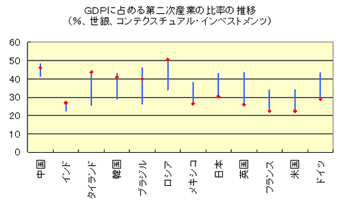 今日のまとめ 1. 中国経済は第二次産業への依存度が高い 2. 中国の消費セクターはまだまだ規模が小さい 3. 中国政府の大型景気テコ入れ策はそれなりに良く練られている 4. しかし即効性の面からは「箱物」への投資が景気浮揚効果を生みやすい ■中国経済の工業部門への依存 中国経済はGDPの中に占める第二次産業の占める比率が極めて高いです。第二次産業とは工業や製造業などを指します。歴史的に見て各国の経済はその成長発展段階の或る時点において高度な工業化を経験し、その後、所得が向上し賃金水準が上昇するとともにだんだん経済の中心がサービス業に代表される第三次産業へと移ってゆく傾向があります。下の図は主要国のGDPに占める第二次産業の比率を過去のレンジ(青色)で示したものです。これを見ると米国、英国、フランス、ドイツ、日本など先進国はいずれも現在、第二次産業比率が最も低くなっていることがわかります。(出典:CFRブログ、ブラッド・セッサー) ■内需、内需と言うけれど・・・ さて、日本がバブルに踊った1980年代はアメリカから「日本は輸出ばっかりじゃなくて、もっと内需を拡大すべきだ」という要求をしばしば受けました。当時は日本も景気が良かったのでどんどん高級ブランドやレジャー産業も普及し、貿易不均衡是正への努力は「それなりにやった」という実感を私のようにその時代を生きてきた人間としては感じます。(ティファニーが日本へ進出し、浦安にディズニーランドができたのはこの頃です。)日本が歩んできた、「いつか来た道」を、いま中国が歩むことが世界から期待されています。とりわけサブプライム問題以降、米国の消費の先行きが怪しくなっているので中国に寄せる世界の期待は並々ならぬものがあります。しかし、この中国内需待望論はどこか間違ってはいないでしょうか? ■そもそもソロバンとして無理 中国の消費者にアメリカの凹んだ部分を穴埋めしてもらうという考え方は、そもそもソロバンとして無理だという事を先ず指摘したいと思います。下のグラフは中国と米国の消費がGDPに占める割合からそれぞれの国の消費市場の規模を単純に算出したものです。 いま、米国の消費市場は約845兆円、一方の中国のそれは76兆円です。米国の消費市場は好景気の絶頂のときと、通常の不景気の谷間では大体、4.5%程度スウィングすると言われています。好景気だった2007年から今年、そして来年にかけての消費の落ち込みはまさしくそういうスウィングの例だと思いますが、そこで失われる消費が大体、38兆円と言われているのです。すると「中国に頑張ってもらおう」と言っている間にも既に中国の全消費の約半分に匹敵する需要が消滅しようとしているわけで、これを中国ひとりに埋め合わせしろというのは土台無理な要求なのです。 ■大型の景気刺激策はどうか? 中国は11月のはじめに4兆人民元という大型の景気テコ入れ策を発表しました。その中には10項目からなる重点項目が盛り込まれています。それらは今後中国が取り組んでゆかねばならない経済の体質改善を考慮した、よく練られたプランであるような印象を受けました。しかし、投入した予算がどれだけすぐに成果を生むか?という実効性から考えた場合、どうしても重工業や建設業などの第二次産業がいちばん即効性を持っていると言わざるを得ません。なぜならそれらのセクターは固定比率が高く、今回の景気後退でとりわけ需要の減退に苦しんでいますから、新しい刺激策を受けることで景気を浮揚する効果が極めて高いからです。 ■「箱物」依存型の復興シナリオになりやすい? もちろん、中国政府は今回の景気刺激策の重点項目の中に環境保全や地方での医療制度・インフラの充実、教育分野への投資など、思慮深い項目を盛り込んでいます。また、雇用創出力の大きいサービス産業への注力も謳われています。しかし目先の投資リターンという点から考えれば、どこかの国がそうであったように所謂、「ハコモノ」に傾倒した財政撒布こそ一番効き目があるのも事実なのです。