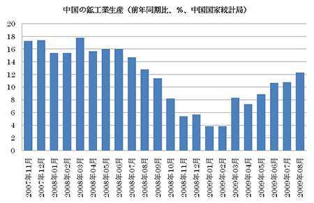 今日のまとめ 1.8月の経済指標は市場参加者の懸念を払拭するものだった 2.唯一の問題点は貿易が引き続き低調だったことである■概ね良好だった8月の経済指標中国の8月の経済指標は先月の統計よりも内需の加速を示すものが多く、市場参加者を安心させるものでした。1月から8月の都市部における固定資産投資は+33%で、市場予想を若干上回りました。また1月から7月までの固定資産投資が+32.9%だったことから8月のペースはピックアップしていると言えます。8月の鉱工業生産は+12.3%と7月の+10.8%より大きく改善しました。8月の小売売上高は+15.4%でした。これは7月の+15.2%より高い数字でした。次に物価に目を転ずると消費者物価指数は前年同期比▼1.2%、生産者物価指数は前年同期比▼7.9%と相変わらずインフレを感じさせない数字となっています。さて、人民銀行によると8月の人民元建て銀行融資は4,104億人民元で、7月の3,559億人民元より多い数字でした。これはポジティブ・サプライズでした。唯一の懸念点は貿易です。輸出は前年同期比で▼23.4%ですが7月に比べると+3.4%でした。(なお7月は6月に比べて+5.2%でした。)輸入は前年同期比で▼17%であり、7月に比べると+1%でした。(なお7月は6月に比べて+3.5%でした。)これらのことから貿易に関しては基調としては改善途上にあるけれど、回復のモメンタムは先月より鈍化していると言えると思います。結論的には中国経済は先月同様、しっかりした足取りを辿っていると言えます。しかし貿易の回復が遅々として進まないことから、引き続き緩和的な金融政策に依存するかたちになっていると言えるでしょう。