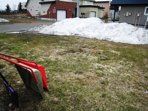 隣の空き地の残雪と我が家の除雪用具