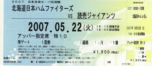 交流戦 北海道日本ハムファイターズvs読売ジャイアンツのチケットが届きました。前回のオープン戦同カードと同様にアッパーシート最前列をゲットです。今回は親孝行を兼ねて妻とお袋の3人で観戦に行きます。ん?5月22日?運動会直前だった?仕事はサボって年休で行ってきます。