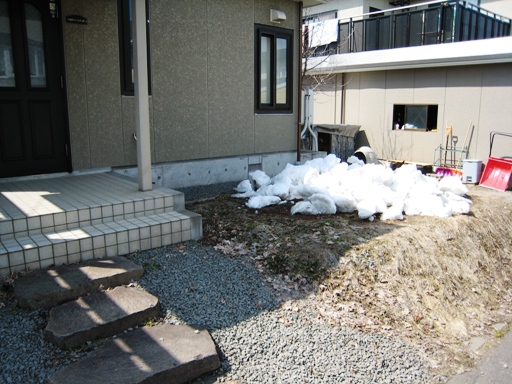 週末に久しぶりに実家に顔を出したら、さすがに雪は少なくなってました。上は2月8日撮影の写真。下は4月8日撮影の写真。灯油タンクの横に残っている雪山は屋根の雪下ろしをした名残です。
