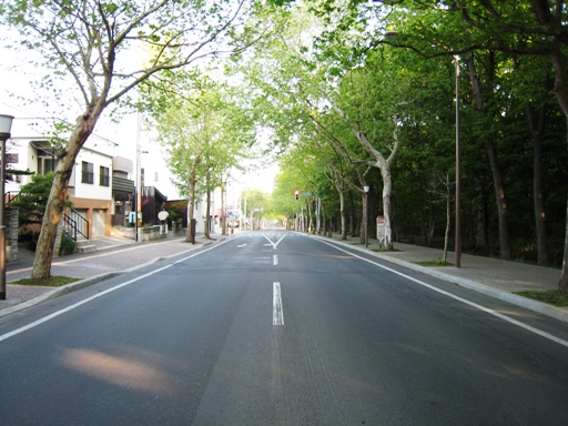 新緑の旭川市神楽岡プラタナス並木、右手は神楽岡公園です。神楽岡公園の散歩はとても気持ちがいいので、ウオーキングしている人をたくさん見かけます。真夏のセミの声は聞くだけで暑くなるのでNGですが、早春から初夏にかけての小鳥のさえずりは最高です。