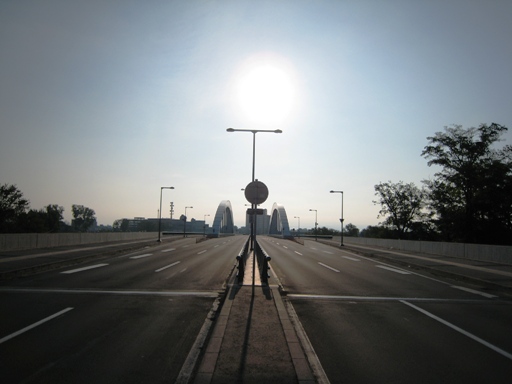 朝日がまぶしい「新神楽橋」です。早朝で交通量ゼロだったので、中央分離帯からの撮影です。