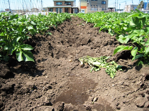 旭川市永山の貸し農園「せせらぎ農園」ではジャガイモ、大豆、トウモロコシ、ニンジン、モロッコ豆、ヤーコンなどを栽培しています。ジャガイモはメークイン、キタアカリ、レッドムーンの3品種を各2キロずつ植えてあります。ジャガイモの生育は順調。2回目の土寄せも完了。すくすくと育っています。つぼみもふくらんできました。