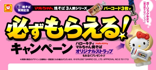 「ご当地キティー」って言うんでしょうか?地域限定のHello Kittyってあちこちで見かけますね。そんなものにはぜんぜん興味はないのですが、なぜかこのストラップだけは「絶対にほしい!」と思ってしまいました。だって、あのキティーちゃんがマルちゃん焼きそばを持ってるなんてナンセンスの極地だと思いませんか。「マルちゃん焼きそば」というレアさ加減がツボに入ってしまいました。でも、自分はストラップしない派なんですが…。このために?マルちゃん焼きそばを一生懸命食べました(笑)。ちなみに、関係ないけどマルちゃんの「やきっぺ」も「やきそば弁当」も「大判やきそば弁当」も「でっかいやきそば弁当」大好きです(大笑)。そして、今日ようやく届きました。どうでしょう?笑えませんか?