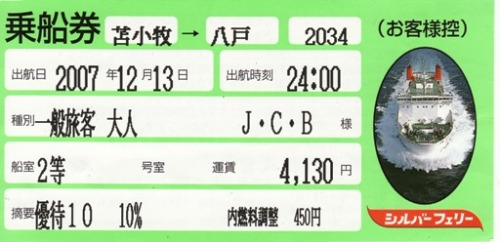 体調を崩していた妻方の伯母が亡くなりました。伯母は青森県十和田市郊外の農村集落に暮らしていました。訃報を聞いて、妻はとりあえず十和田へ。オレは数日の「ひとり暮らし」の後、単身で十和田へ向かいました。13日(木)定時で退勤し、急いで荷造り。忘れちゃいけないのは喪服と数珠と黒の革靴。あとは三泊分の着がえと洗面道具。自分一人で旅支度をするのは何年ぶりでしょうか。えーっと、パンツはどこだ?最近、ETCをつけたので「ETC通勤割引」を使わない手はありません。「ETC通勤割引」とは17時から20時までの間に100キロまでの利用なら通行料金が約50%オフになるという制度。旭川鷹栖ICを20時直前に通過し、道央道を南下。旭川鷹栖ICから100キロ未満で最遠インターになる岩見沢ICで一般道へ。通行料金は1300円也。一般道で苫小牧港へ。到着は22時30分。クルマは駐車場に置いていきます。荷物を持ってシルバーフェリーのカウンターへ。船に乗るには乗船名簿に住所やら氏名やら何やらかんやら記入しなければならないのですが、インターネットで予約していたので、プリントアウトとした確認メールを提出するだけで乗船名簿への記入は省略。苫小牧発八戸行べが2等はインターネット予約で10%割引になり4130円也。「八戸行きシルバーフェリーべがへの乗船案内は23時を予定しています」とアナウンスが聞こえる中、売店で夕食を物色するが見あたらず。弁当売り切れ!しょうがなく、缶ビールを夕食の代わりに…。23時ちょうどに乗船。船内はがらがら。貸し毛布は400円也。さっそく、ハンディレシーバーでスキャン開始。船舶無線の交信はヒットしないものの、業務無線(?)の周波数帯で船内へのトラックや乗用車の積み込み作業や船員同士の交信が聞こえてきました。さっそくこの周波数をメモリー。出航まで時間があるとはいえ、船内はがらがらです。むこうの角におっさんが一人。こっちの角にオレ。一区画の定員は60名(そんなに乗ったらびっちりだけど)と書いてありますが、どの区画にも1人か2人しかいません。二等船室はこんな感じ。することもないので、ハンディレシーバーをイヤホンでワッチしながら、ビール。おつまみはじゃがりこ。持ってきた文庫本を読んでいるうちに24時定刻に出航。八戸港まで7時間30分の航海です。あまりにも空いているので、じゃがりこを食べる音が船室内に響きまくります。3本目のビールを飲み干したところで、消灯となりました。