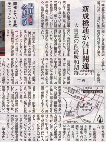 新聞記事は北海道新聞2010.12.11朝刊以前、宮前跨線橋があった新成橋通の延長部分が24日に開通する。交通の流れがスムーズになり、大雪通の渋滞が緩和されるのは多いにけっこう。ただし、今回開通する新成橋通はオレの通勤道路。より便利になって新成橋通の交通量が激増するということはオレの通勤時間が長くなるということ。開通後は今までよりも早く家を出なきゃならんかなあ。