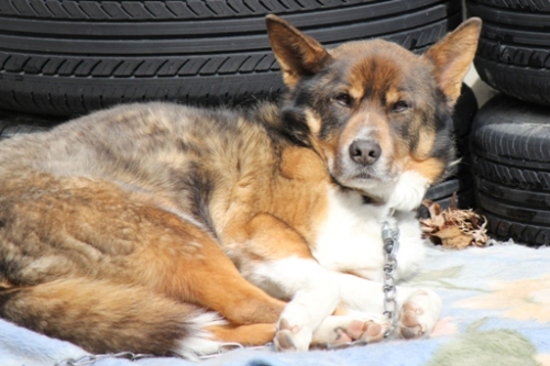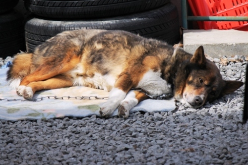 お隣のライト。春の日射しの中で腹を出してお昼寝中。そんなんじゃ、番犬としてのお役目は果たせないよ。毛がまだらに見えるのは冬毛から夏毛への生え替わり中だから?あれ?起こしちゃったかな?