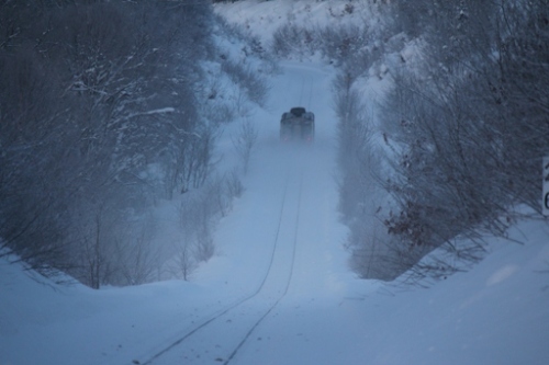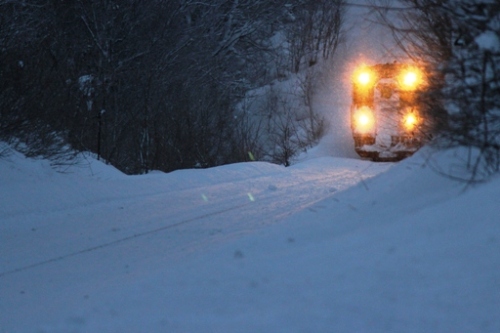 富良野線美瑛-美馬牛の通称「すり鉢」にて、日の出直後の上り始発列車。