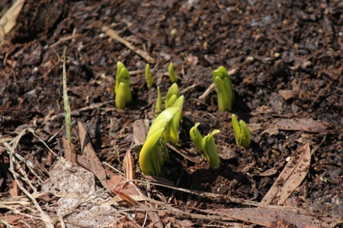 雪どけとともに芽を出した庭の片隅のギョウジャニンニク。たった1週間でニョキニョキと…。