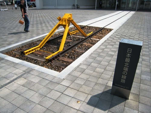 稚内駅は今春改築された新しい駅舎。旧駅舎時代に最北端であった場所にあるモニュメント。ホームにはスーパー宗谷が入線中。新駅舎から北に延びるレールのモニュメント。